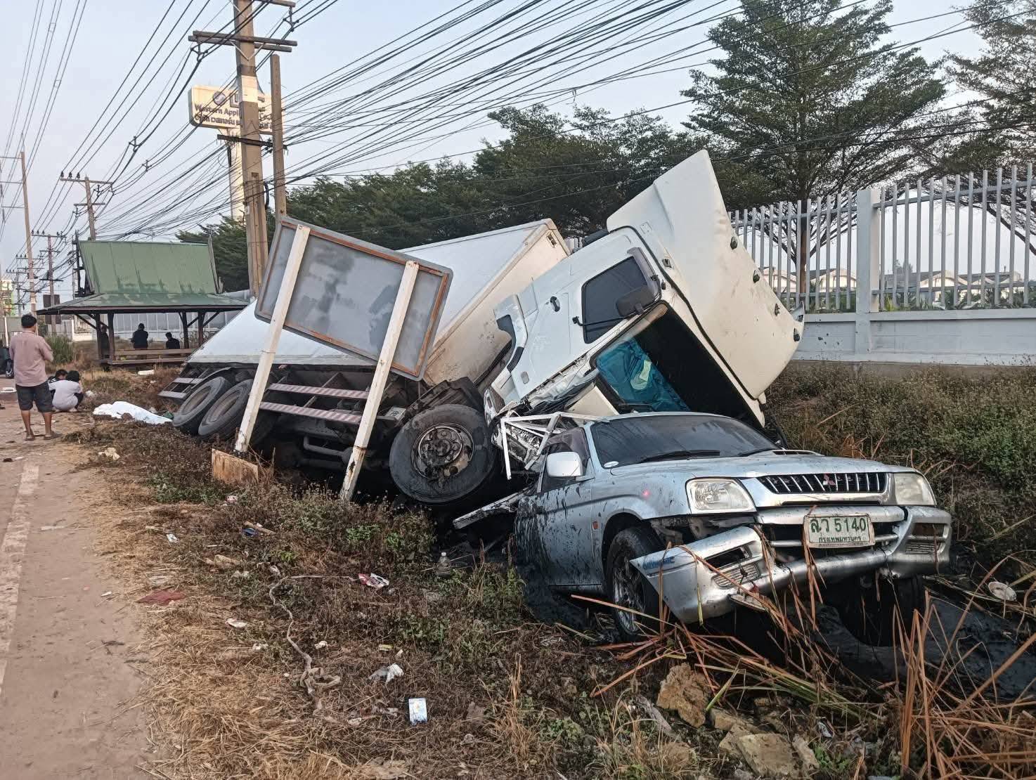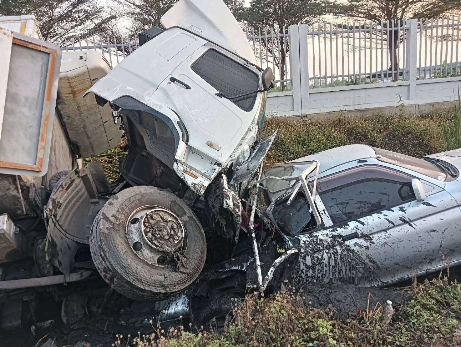 เกิดเหตุรถบรรทุก 10 ล้อหลับใน พุ่งชนรถกระบะที่จอดข้างทาง